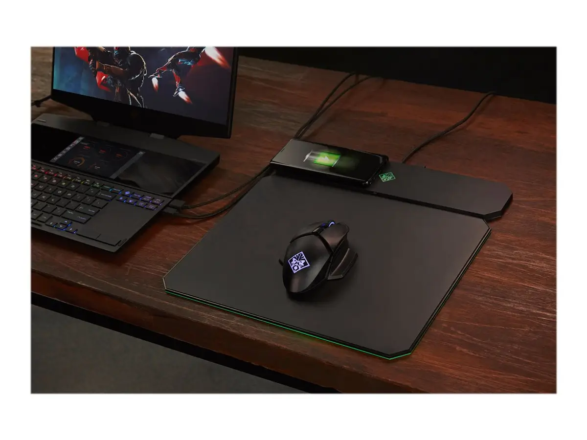 HP OMEN Charging Mouse Pad, tapis de souris charge sans fil, tapis souris gaming, chargeur sans fil souris, OMEN, HP, accessoires gaming, tapis de souris noir, Qi charging mouse pad, tapis souris gamer.